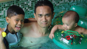 Aku ingatkan dia benti tepi jalan belikan pelampung Rayyan je. Rupanya beli buih sekali. Dia satu, Redza satu. Aku tengok pun macam...err....