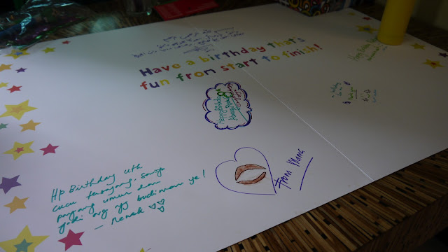 Dulu time kawen tak terpikir nak sediakan buku untuk guest datang tulis wish. So aku buat la masa besday Redza. Beli kad giant size and letakkan atas meja. Beli one set colourful marker, ha mari semua tulis atas kad ni.